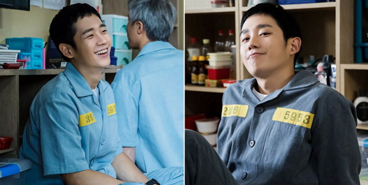 공개된 사진에는 푸른색 계열의 죄수복을 입고도 촬영장에서 미소를 지어 보이는 정해인의 모습이 담겨있다.