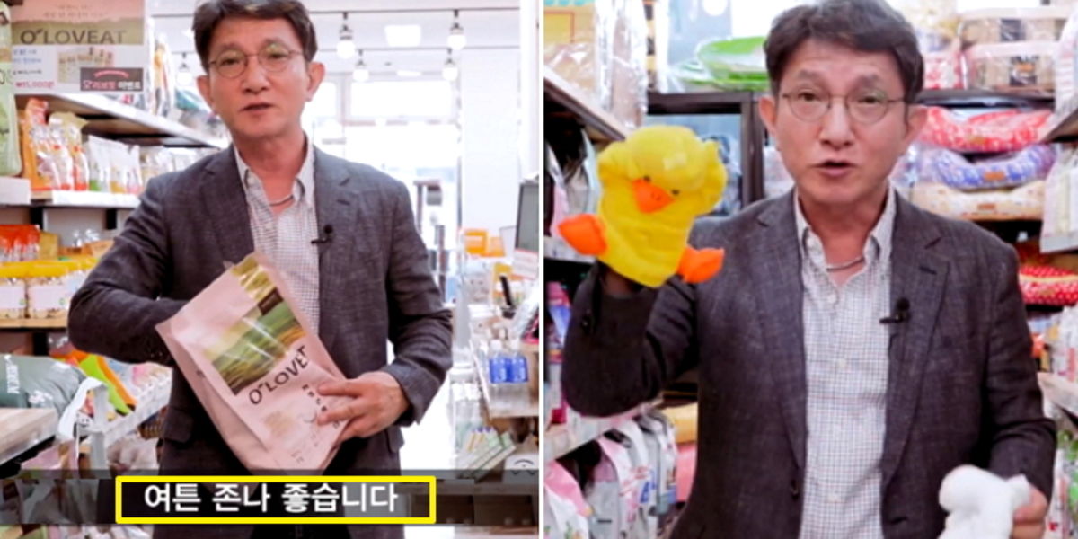 아랑곳하지 않고 "아따 사료 맛있다"라고 말한 최대표는 인형을 이용해 깜찍한 율동을 선보이며 사료가 단백질이 풍부하다는 것을 홍보한다.
