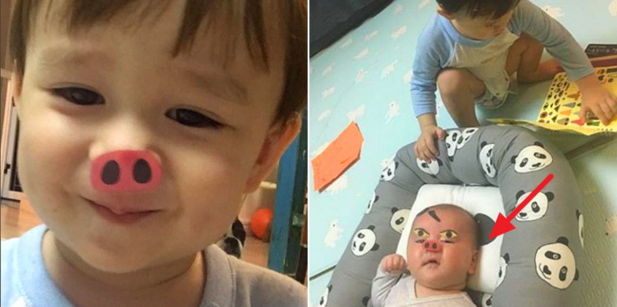 윌리엄은 자신의 코에 붙인 돼지 코 스티커를 동생 벤틀리의 얼굴에도 똑같이 붙였다.