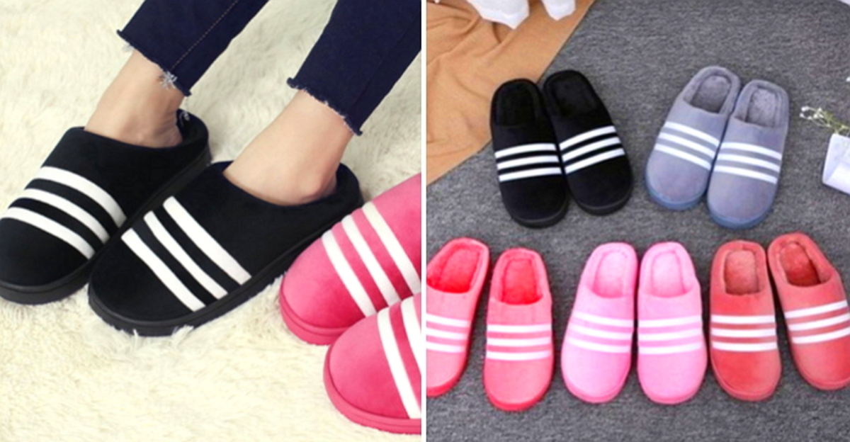 해당 슬리퍼는 학교나 직장에서 많이 신는 삼선 아디다스 슬리퍼처럼 줄무늬가 있지만, 전면이 따뜻한 털로 이루어져 있다.