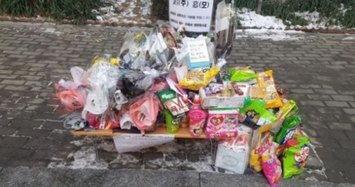 아파트 단지 한 나무 아래에는 아이가 살아생전에 좋아했을 과자와 꽃, 그림 등이 수북하게 놓여져 있어 보는 이들의 마음을 미어지게 했다.
