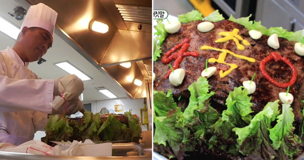 김건모는 먹음직스럽게 잘 구워진 스테이크를 차곡차곡 쌓아 4단으로 만들었다. 그리고 상추와 마늘 등으로 장식하더니 쌈장으로 '축 40'이라고 글씨를 적었다.