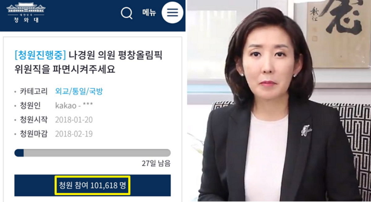 [인사이트] 배다현 기자 = 나경원 자유한국당 의원을 평창올림픽 조직위원회에서 파면시켜달라는 청와대 청원이 많은 이들의 지지를 얻고 있다.