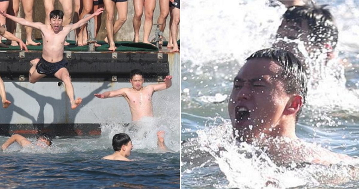 장병들은 먼저 2km의 알몸 구보를 하고 바닷가에 도착한 다음 입수했다.