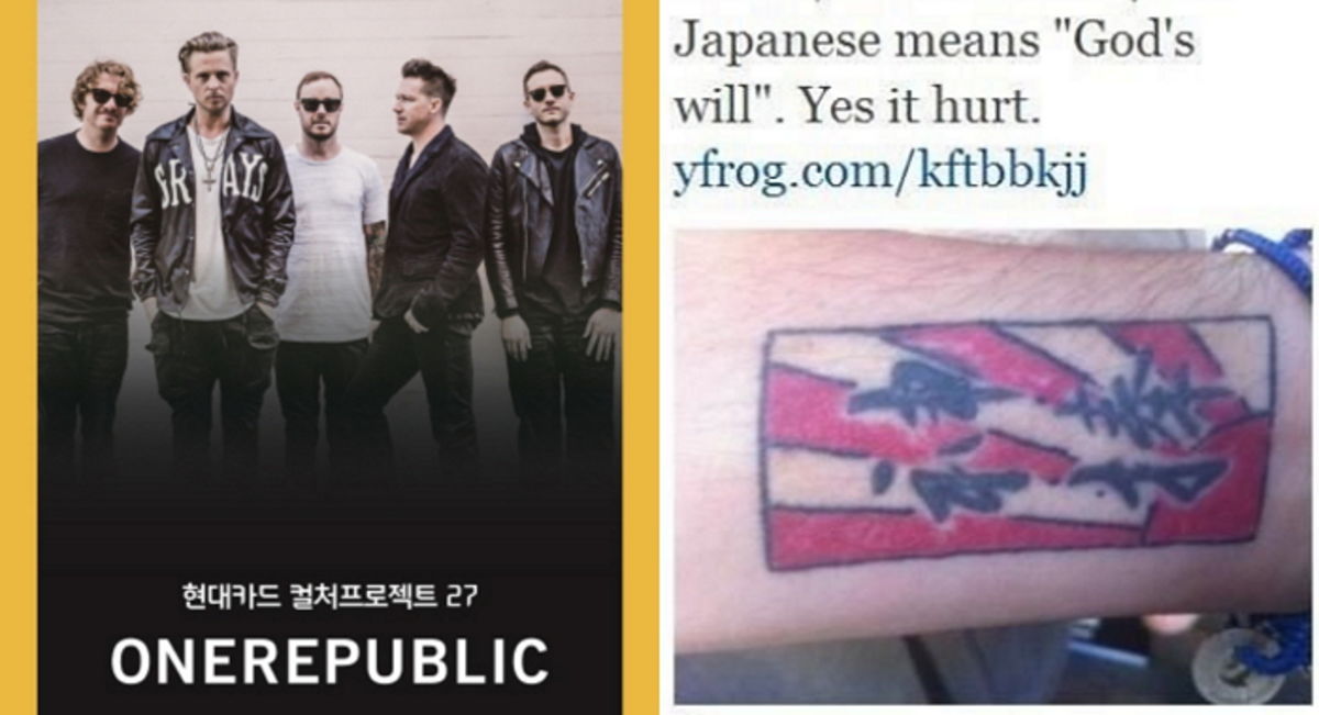 문제는 원리퍼블릭의 보컬 라이언 테더(Ryan Tedder)가 팔에 전범기(욱일기) 문신을 새긴 상태라는 것이다.