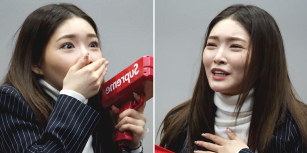 총구에서 가짜 지폐들이 쏟아지자 청하는 화들짝 놀라며 '동공 지진'을 일으켰다.