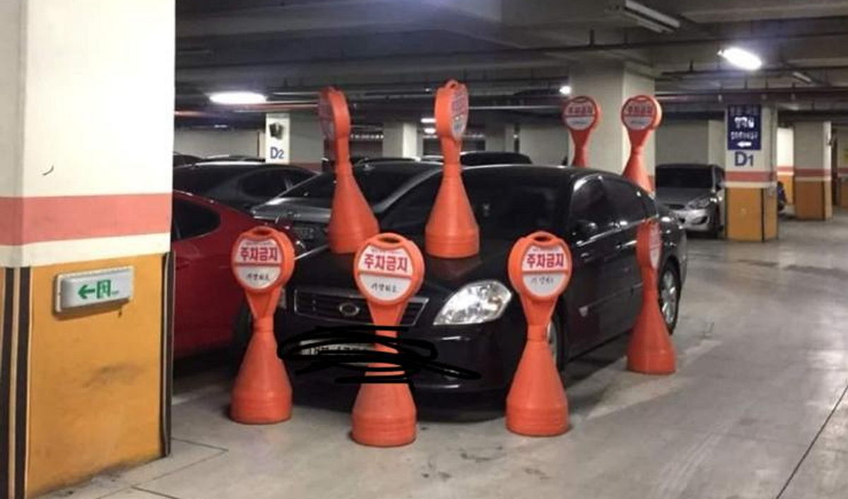 지하 주차장에 빈 자리가 없었던 모양인데 다른 차량이 운행하는데 불편을 초래했던 모양이다.