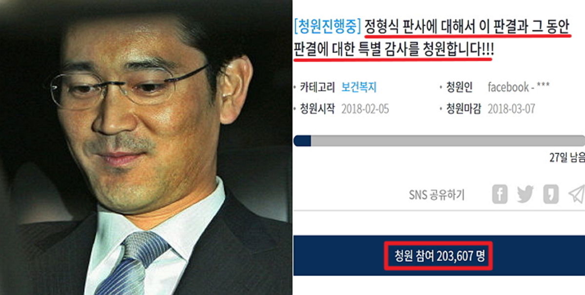 이후 청와대 청원 게시판에는 이 부회장 판결을 '유전무죄, 무전유죄'라 지적하며 정 부장판사를 특별 감사해야 한다는 목소리가 터져나왔다.