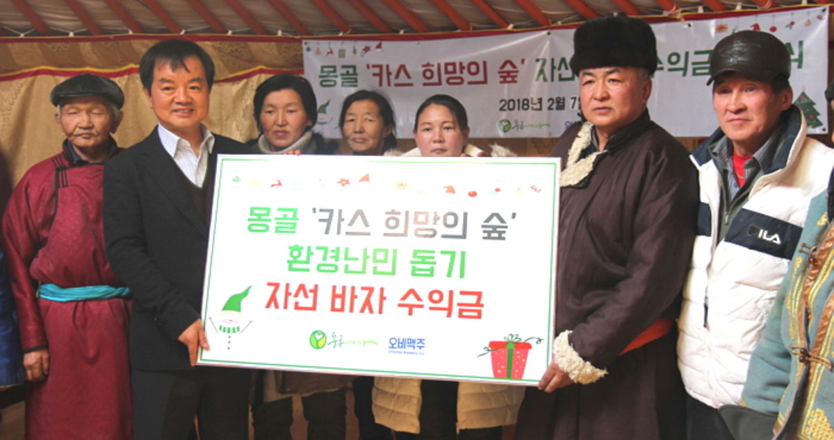 오비맥주 관계자는 "사막화로 생활 터전을 잃은 몽골 환경난민들은 어려운 환경 속에서도 몽골의 사막화 방지를 위한 '카스 희망의 숲' 조성사업에 동참하고 있어 이번 기부 행사를 하게 됐다"고 말했다.