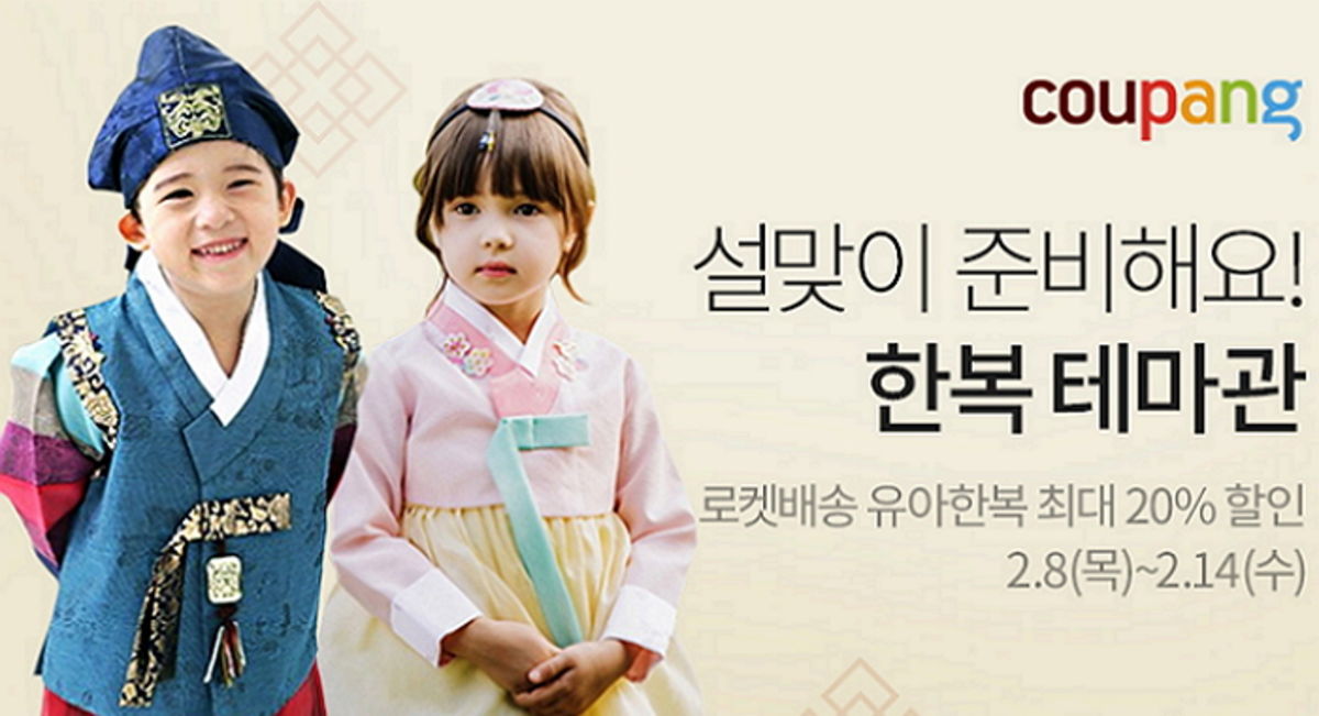 쿠팡은 '한복 테마관' 오픈과 함께 로켓배송 유아 한복을 최대 20% 즉시 할인하는 프로모션을 오는 14일까지 진행한다.