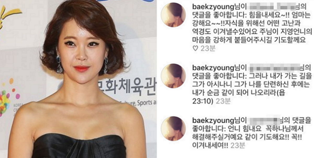 백지영은 누리꾼들의 정성 어린 위로의 글을 무시하는 대신 일일이 '좋아요'를 누르며 화답했다.