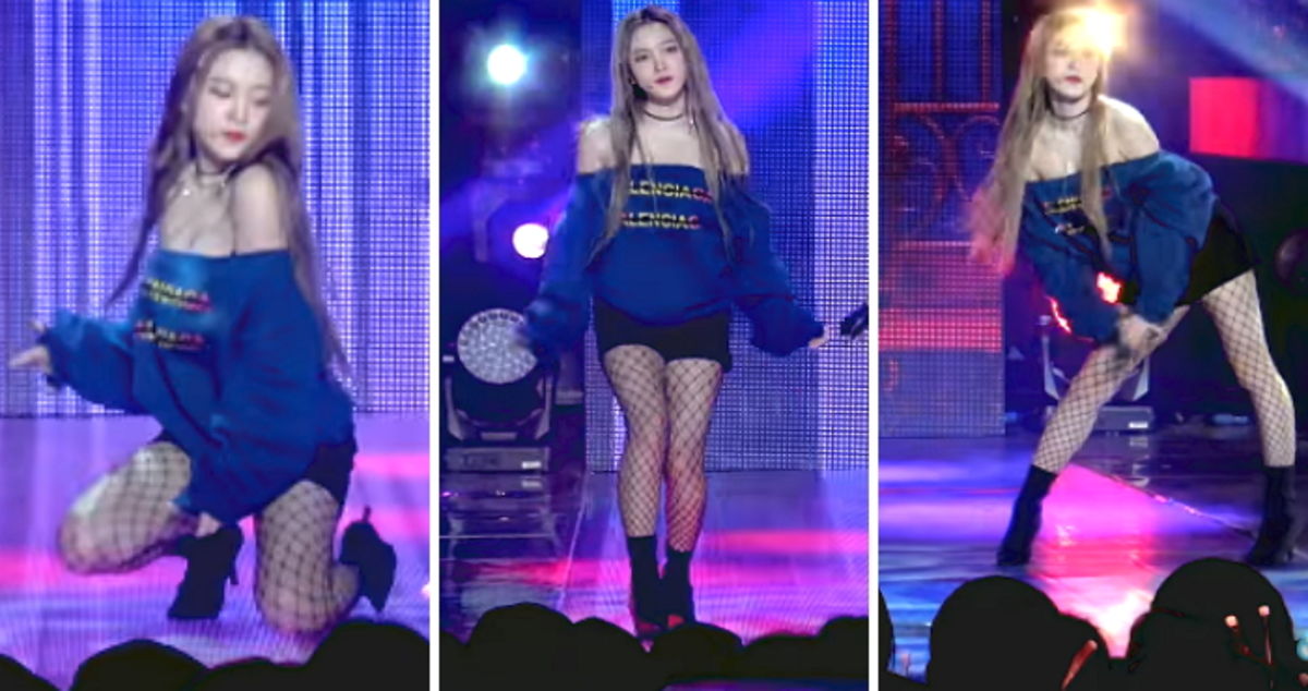 무대에 오른 레드벨벳 예리는 깊이 파인 오프숄더 스웨트셔츠를 착용한 모습이었다. 여기에 짧은 핫팬츠까지 입고 있었다.