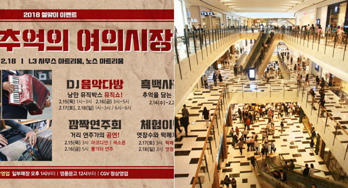 여의도 IFC몰은 밸런타인데이와 설 연휴 동안 이색적인 몰캉스를 원하는 고객들을 위해 남녀노소 누구나 즐길 수 있는 7080 컨셉의 'IFC몰 추억의 여의시장' 이벤트를 진행한다.