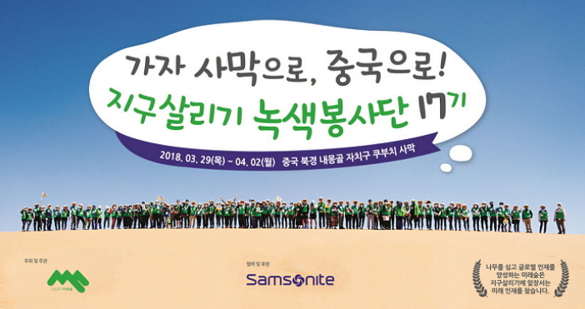 제 17기 녹색봉사단은 오는 3월 29일부터 4월 2일까지 5일간 쿠부치 사막을 방문해 식수활동을 비롯한 모의 UN, 멘토링, 워크샵 등 다양한 프로그램에 참여하게 된다.