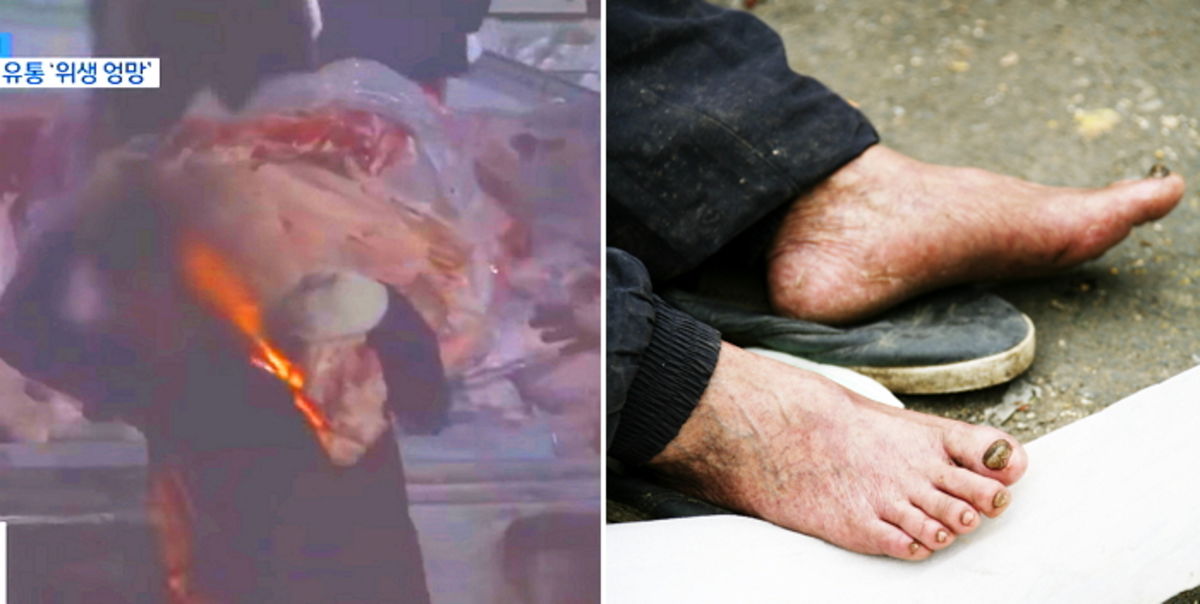 고기의 씌운 비닐이 거의 다 벗겨진 상태인데도 인부들은 죄책감 없이 고기를 질질 끌고 발로 밟고 다닌다. 먼지 묻은 차량 바깥에 걸쳐져 있는 생고기도 발견됐다.
