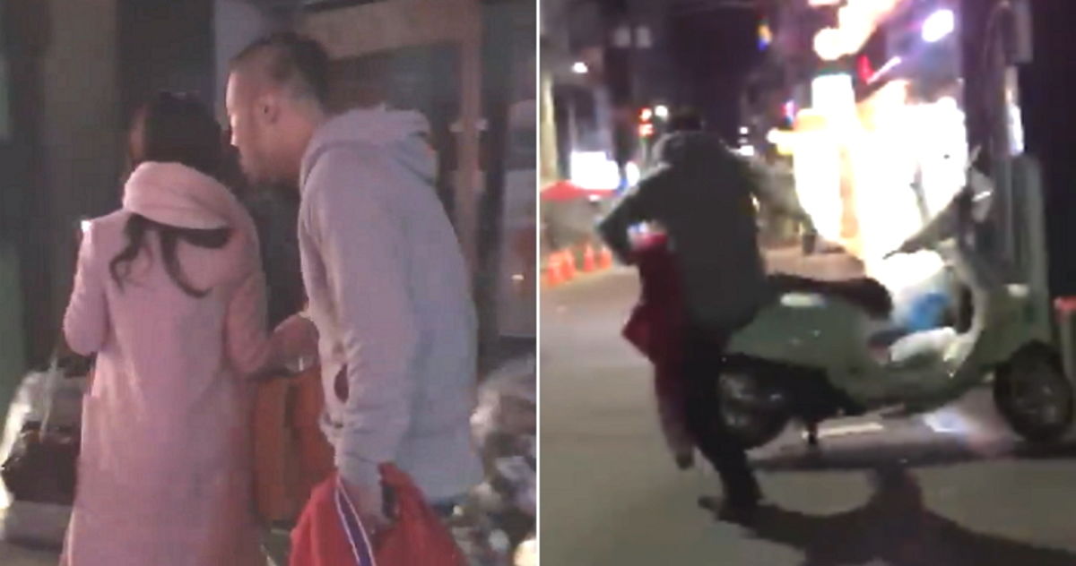 남성은 자리를 뜨면서 음식점 앞에 세워져 있던 오토바이를 발로 차 넘어뜨리기도 했다.