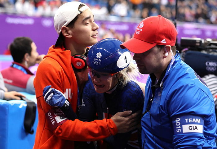 여자 500m 세계기록 보유자인 영국의 엘리스 크리스티는 17일 강릉아이스아레나에서 열린 쇼트트랙 1,500m 준결승에서 결승지점을 앞두고 리진위(중국)과 충돌했다.