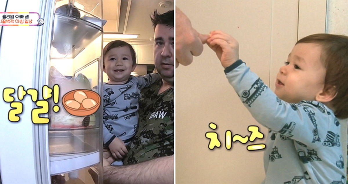 샘 아빠가 냉장고를 열자 윌리엄은 식료품들을 가리키며 "치즈", "딸기", "고기", "주스", "달걀" 등의 단어를 서투르지만 또박또박 읊어 보였다.