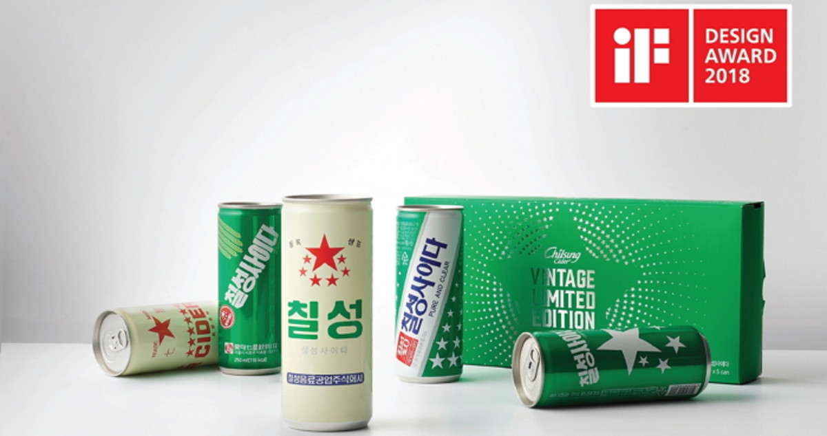 독일 'iF 디자인 어워드 2018'에서 음료 패키징 부문 본상을 수상한 롯데칠성음료 '칠성사이다 빈티지 패키지'는 칠성사이다의 역사와 정체성을 5개의 패키지 디자인으로 표현한 제품이다.