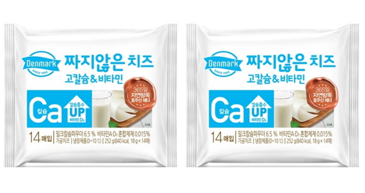 반면 동원 F&B가 선보인 '덴마크 짜지않은치즈 고칼슘&비타민'은 1장당 나트륨 함량이 100mg에 불과해 짜지 않고 담백하다.