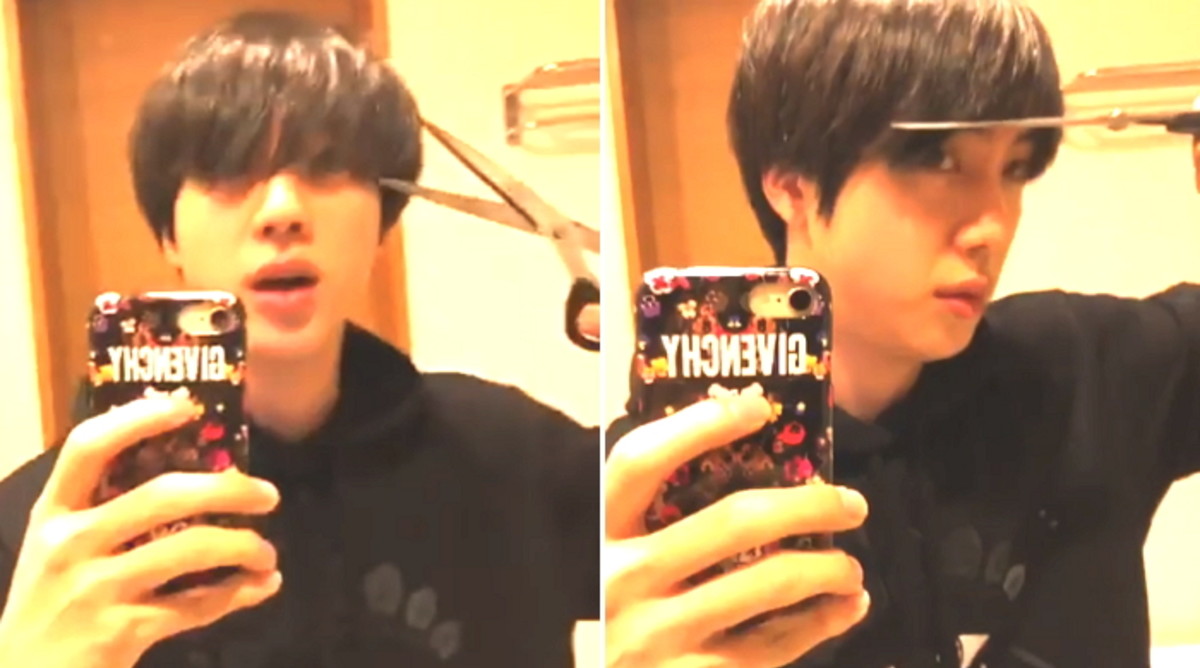 [인사이트] 디지털뉴스팀 = 방탄소년단 진이 눈이 보이지 않을 정도로 길어버린 앞머리를 부엌가위로 혼자 자르는 모습이 포착됐다.