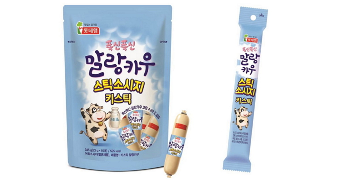 '키스틱 말랑카우'는 롯데푸드의 대표 미니 소시지 '키스틱'에 롯데제과의 대표 소프트캔디 '말랑카우'를 넣어 만든 미니 소시지다.