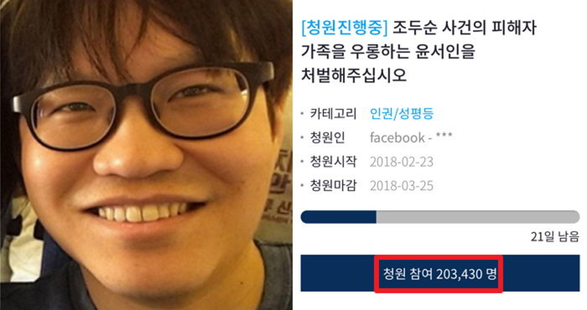 4일 오후 만화가 윤서인 처벌에 대한 청와대 청원 글에는 20만 3,232명이 지지 의사를 밝혔다.