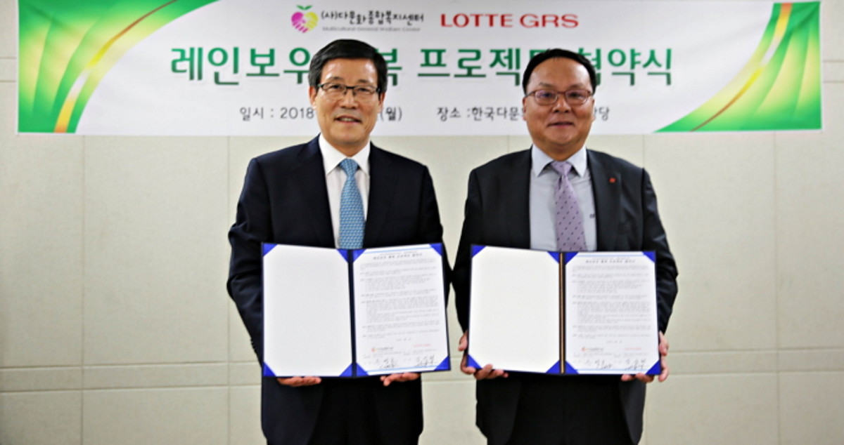 롯데지알에스와 다문화복지센터는 다문화 가정을 위한 '레인보우 행복 프로젝트' 타이틀로 스포츠 체험 교실을 비롯한 한국어 학습 교실, 직업 체험 교실 등 연간 지원 프로그램을 운영할 방침이다.