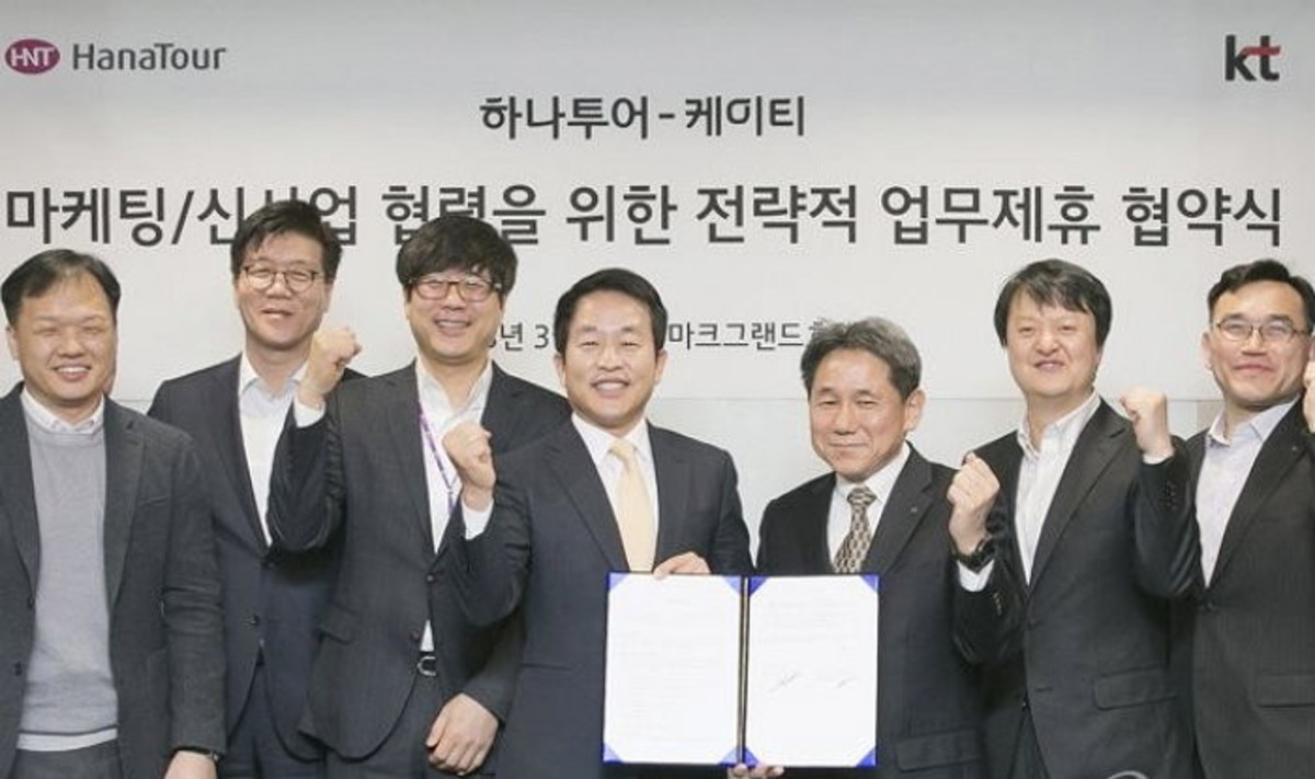 KT와 하나투어는 8일 명동 티마크그랜드호텔에서 신사업 발굴 및 공동마케팅을 위한 업무협약을 체결했다.