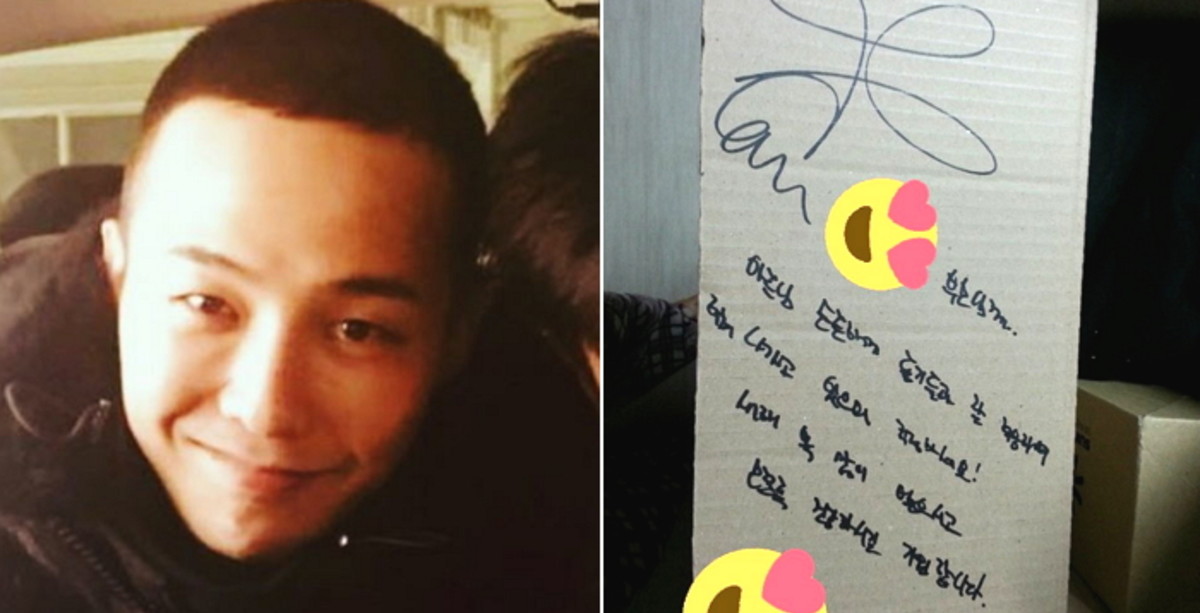 택배 박스 한쪽에 적힌 지드래곤의 사인은 군대 동기들의 가족들에게 전달된 것으로 알려졌다.