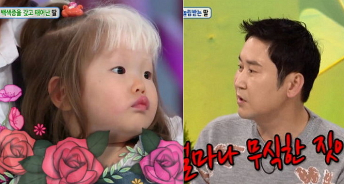 남편의 유전인 백색증을 앓고 있는 딸은 태어났을 때부터 피부 색, 머리색이 연하고 앞머리 부분은 완전한 백발이다.