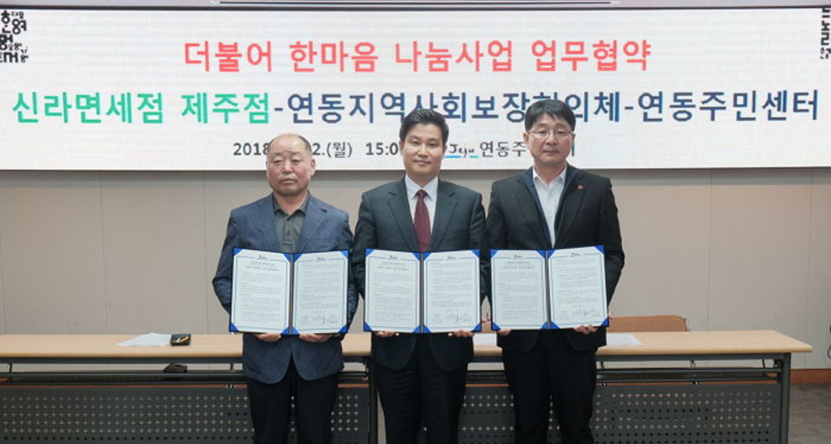 신라면세점 제주점은 지난 12일 제주시 연동주민센터에서 '연동 지역사회보장협의체', '연동 주민센터'와 연동 내 어려운 이웃에게 필요한 복지서비스를 제공하기 위해 ‘더불어 한마음 나눔 사업 업무 협약’을 체결했다고 밝혔다.