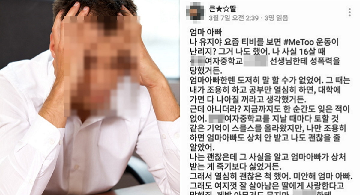 [인사이트] 배다현 기자 = 딸이 중학교 시절 교사에게 성추행 당했다는 사실을 알게된 아버지가 SNS에 글을 올려 비통한 심정을 전했다.