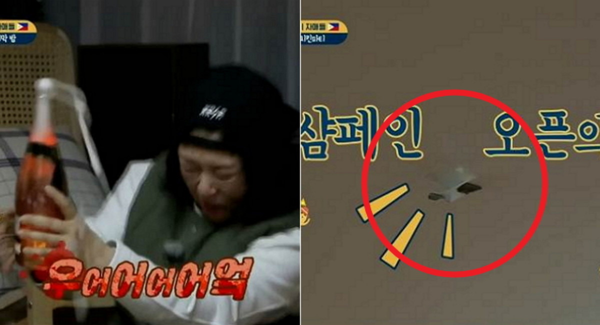 폭발하는 소리에 김숙과 쌍둥이 자매는 크게 놀랐지만 이내 '웃픈' 장면을 목격했다. 발사된 코르크가 '천장'을 뚫어버린 것이다.