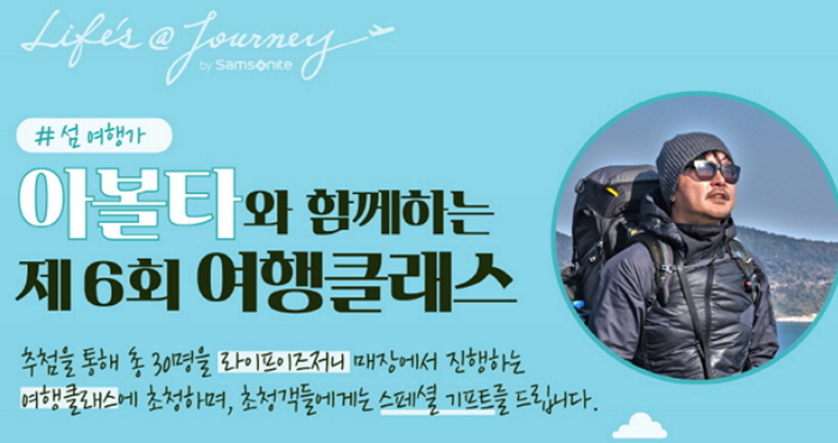 쌤소나이트는 오는 18일까지 'Life's@Journey (라이프 이즈 저니) 스토어' 제 6회 여행 클래스 참가자를 모집한다. 클래스는 롯데백화점 에비뉴엘 잠실점에서 22일 열린다.