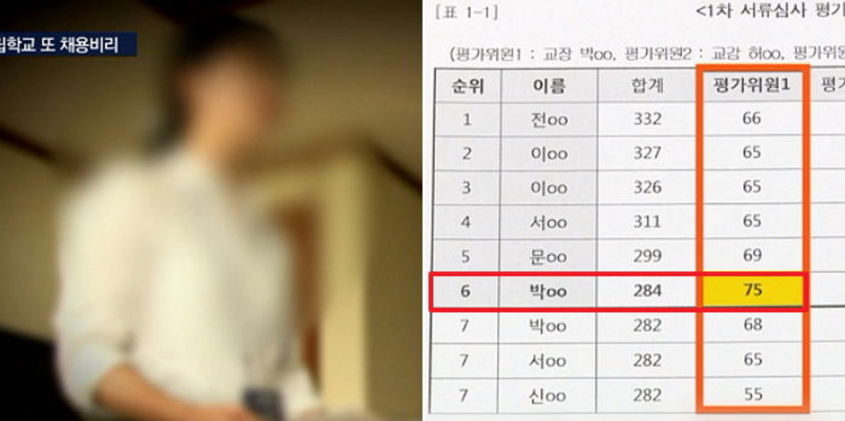 박씨는 6명을 뽑는 서류심사를 6등으로 통과했지만 교장이 채점한 점수를 제외한 뒤 다시 계산한 결과는 12등으로 2차 면접을 볼 자격이 없었다.