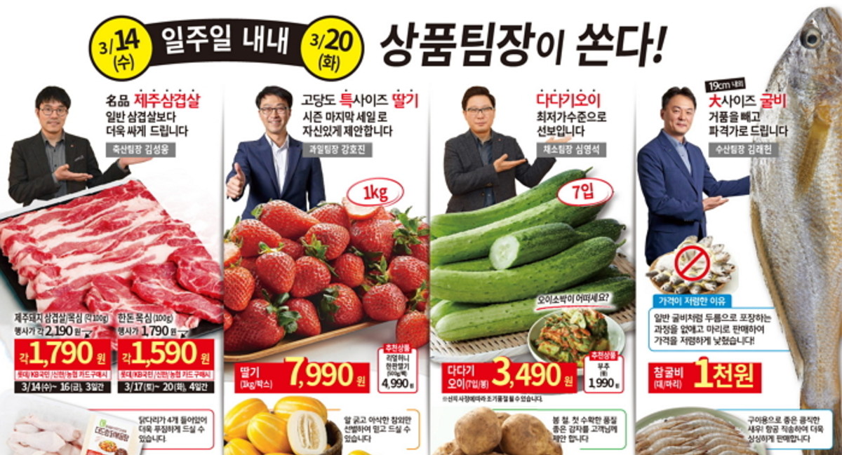 달콤한 맛이 일품인 '리얼허니 한판딸기(500g 팩)'를 4,990원, 딸기(1kg, 박스)를 7,990원에 판매하며 봄철 입맛 돋우는 '오이소박이' 레시피 제공과 함께 '다다기오이(7입 봉)와 부추(봉)을 각각 3,490원, 1,990원에 판매해 반찬 걱정을 덜게 했다.