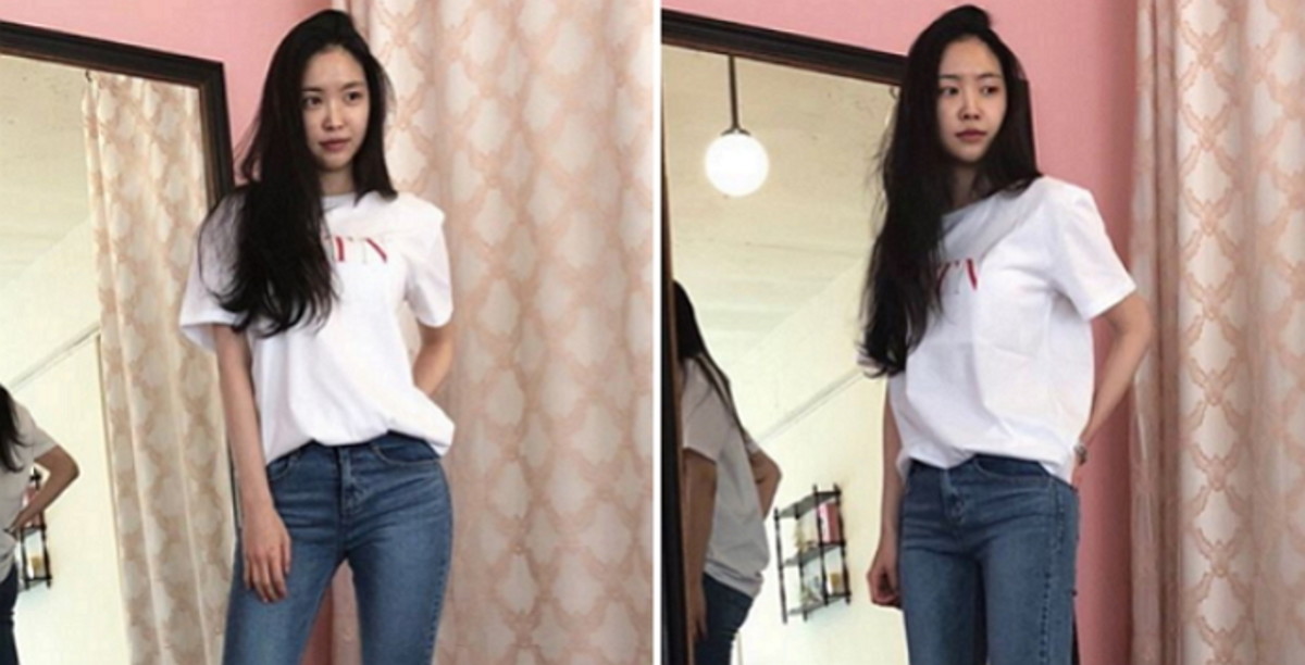 긴 청바지 덕에 돋보이는 손나은의 우월한 다리 길이는 보는 이들의 부러움을 자아낸다.