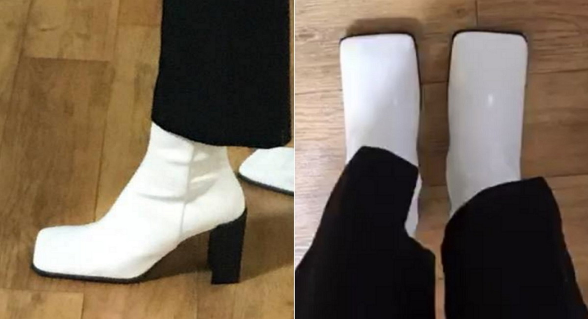 사진 속 신발은 앞코가 각진 형태의 흰색 부츠다. 광택이 나는 소재에 발목까지 올라오는 구두는 검정 바지에 잘 어울여 꽤 트렌디해 보인다.