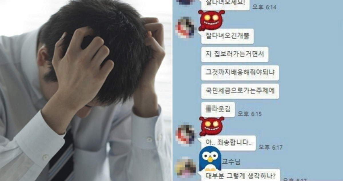 이때 한 학생이 "잘 다녀오긴 개뿔"이라고 메시지를 보내며 문제는 시작됐다. 다른 채팅방에다 쓸 교수의 뒷말을 실수로 이 채팅방에 적은 것.