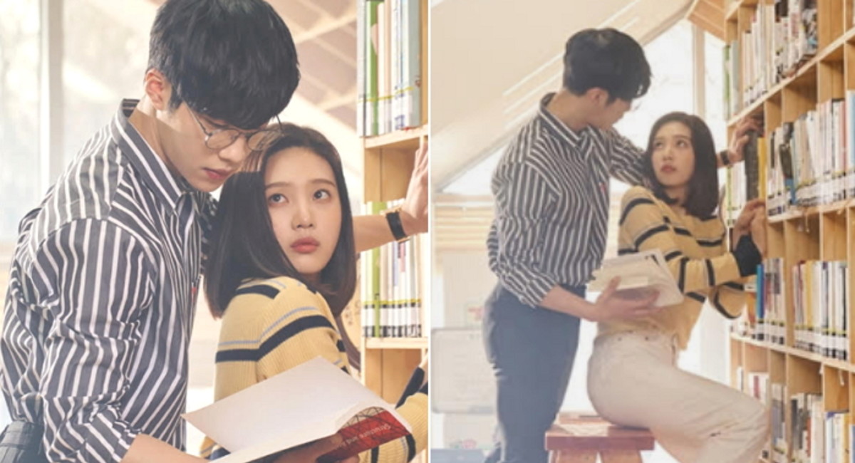 조이는 높이 있는 책을 꺼내기 위해 사다리에 걸터앉아 있고, 우도환은 그런 조이의 등 뒤에 다가가섰다.