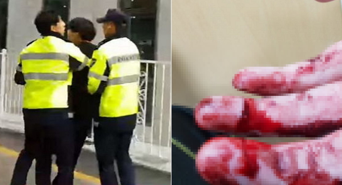 놀란 A씨가 차에서 내리자 집단 폭행이 시작됐다. 특히 봉으로 그를 계속 찔러댄 탓에 A씨의 손은 순식간에 피로 물들었다.