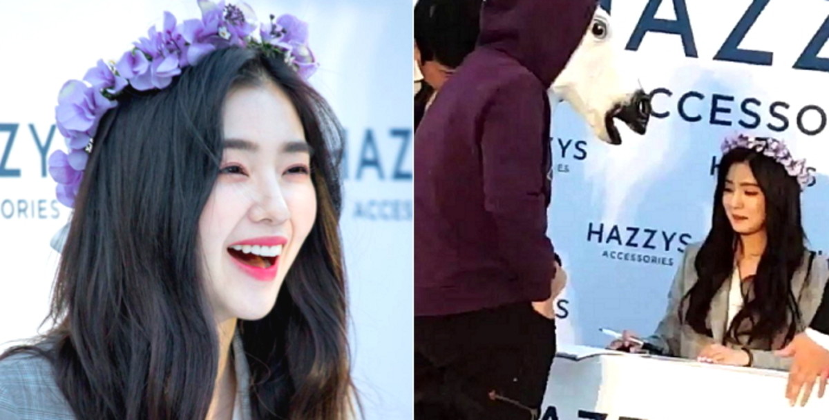 이날 정성스럽게 사인을 해주던 아이린은 멀리서부터 다가온 말 가면을 쓴 한 팬을 보고 놀란 표정을 지었다.