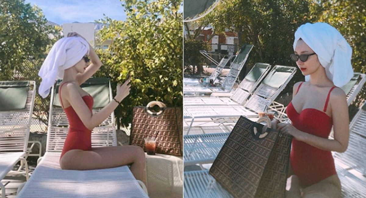 이날 레드립과 잘 어울리는 붉은 수영복을 입고 선글라스를 착용한 고준희는 선베드에 비스듬히 앉아 포즈를 취하고 있다.