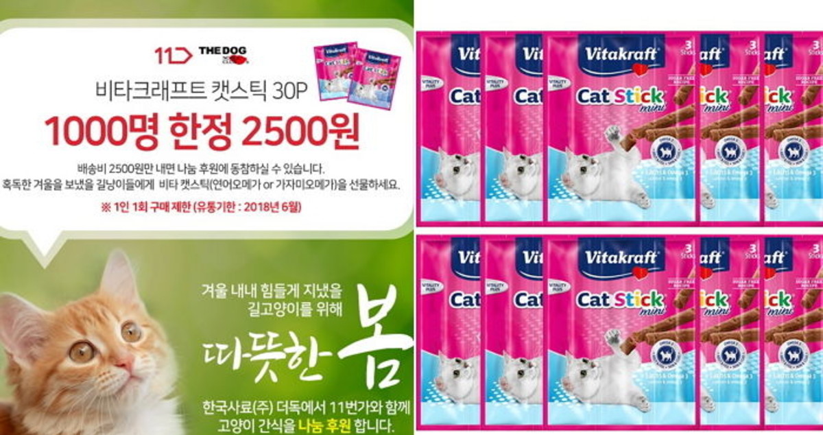 오는 25일 오전 11시 '타임딜'을 통해 2만원 상당의 고양이 간식 '더독 비타크래프트 캣스틱' 3만개를 무료 제공한다. 배송비 2,500원만 내면 된다.