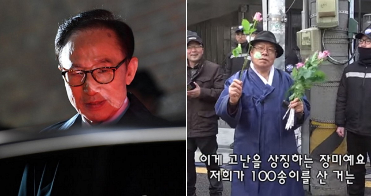 그는 장미가 '고난'을 상징한다며 "우리가 100송이를 산 건 이명박이 70~80평생을 불법과 탈법으로, 또 출세의 수단으로 삼은 그 죄를 참회하는 시간이 길었으면 한다는 뜻"이라고 설명했다.
