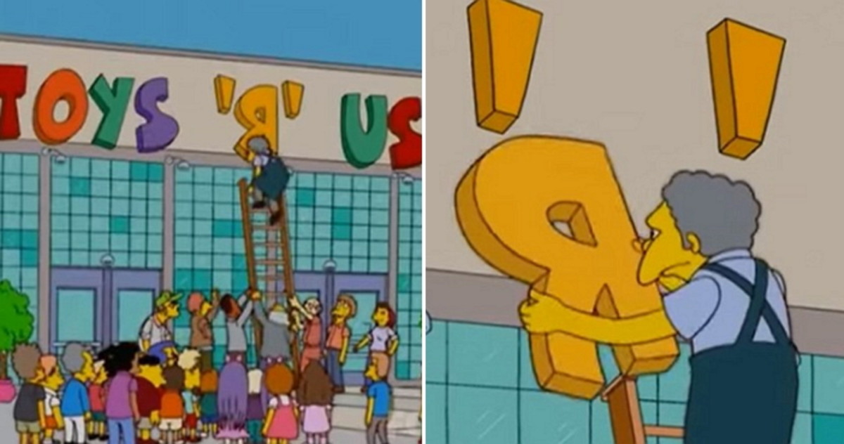 지난 23일(현지 시간) 영국 일간 데일리메일 애니메이션 '심슨 가족'의 2004년 에피소드 중 '토이저러스'(Toys R Us) 간판에서 알파벳 'R'을 떼어내는 장면을 소개했다.