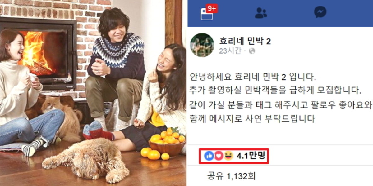 '효리네 민박 2'라는 이름의 한 페이스북 페이지에는 "추가 촬영하실 민박객들을 급하게 모집합니다. 메시지로 사연 부탁드립니다"라는 민박을 유도하는 글이 올라왔다.