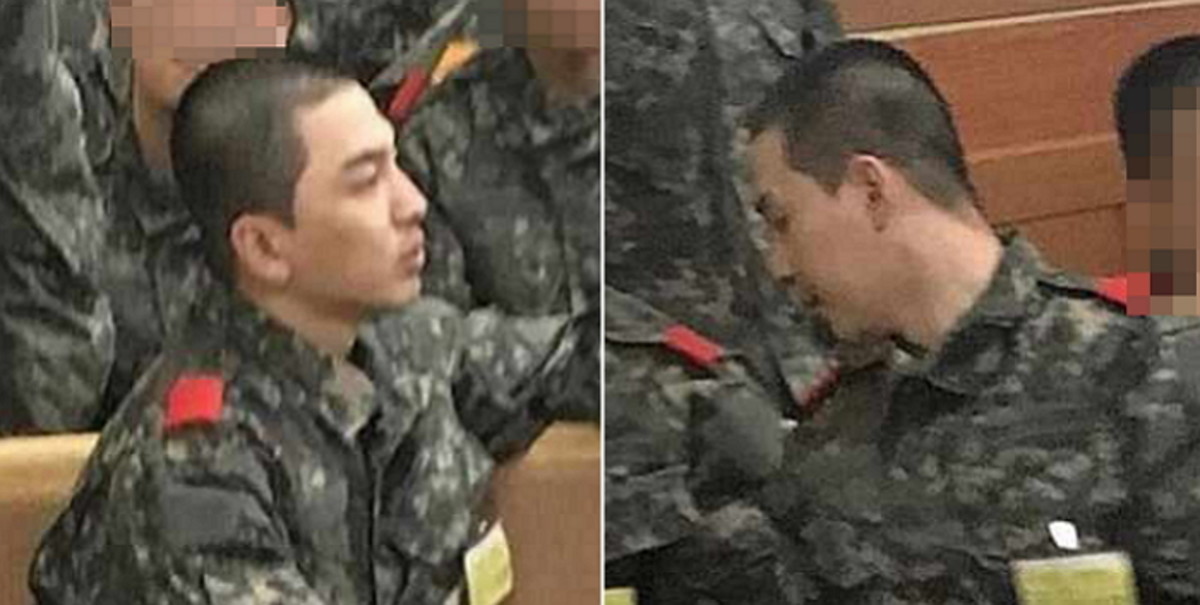 삭발 머리에 군복을 입은 태양의 모습에서는 대한민국 군인다운 늠름함이 느껴진다.