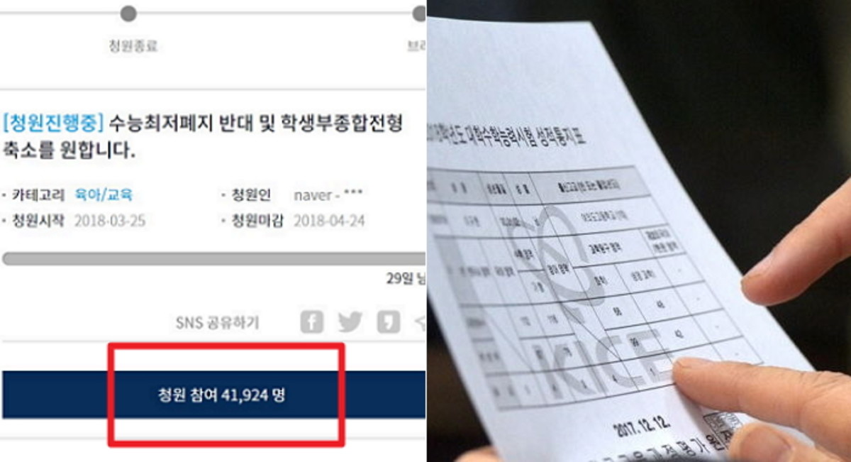 지난 25일에는 "수능 최저 폐지 반대 및 학생부 종합 전형 축소를 원합니다"라는 청와대 청원까지 등장했다. 26일 오전 11시 기준 참여인원 4만 2천여명에 달하고 있다.